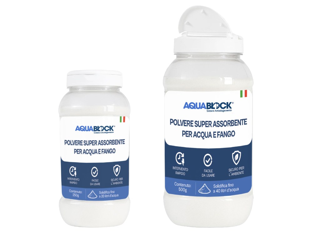 La Polvere Super Assorbente Aquablock si attiva in pochi minuti, trasformando acqua e fango in una massa solida facilmente rimovibile con pala o scopa. È l’ideale per l’utilizzo in garage, magazzini, cantine, spazi tecnici e ambienti industriali, dove velocità e praticità sono fondamentali.
